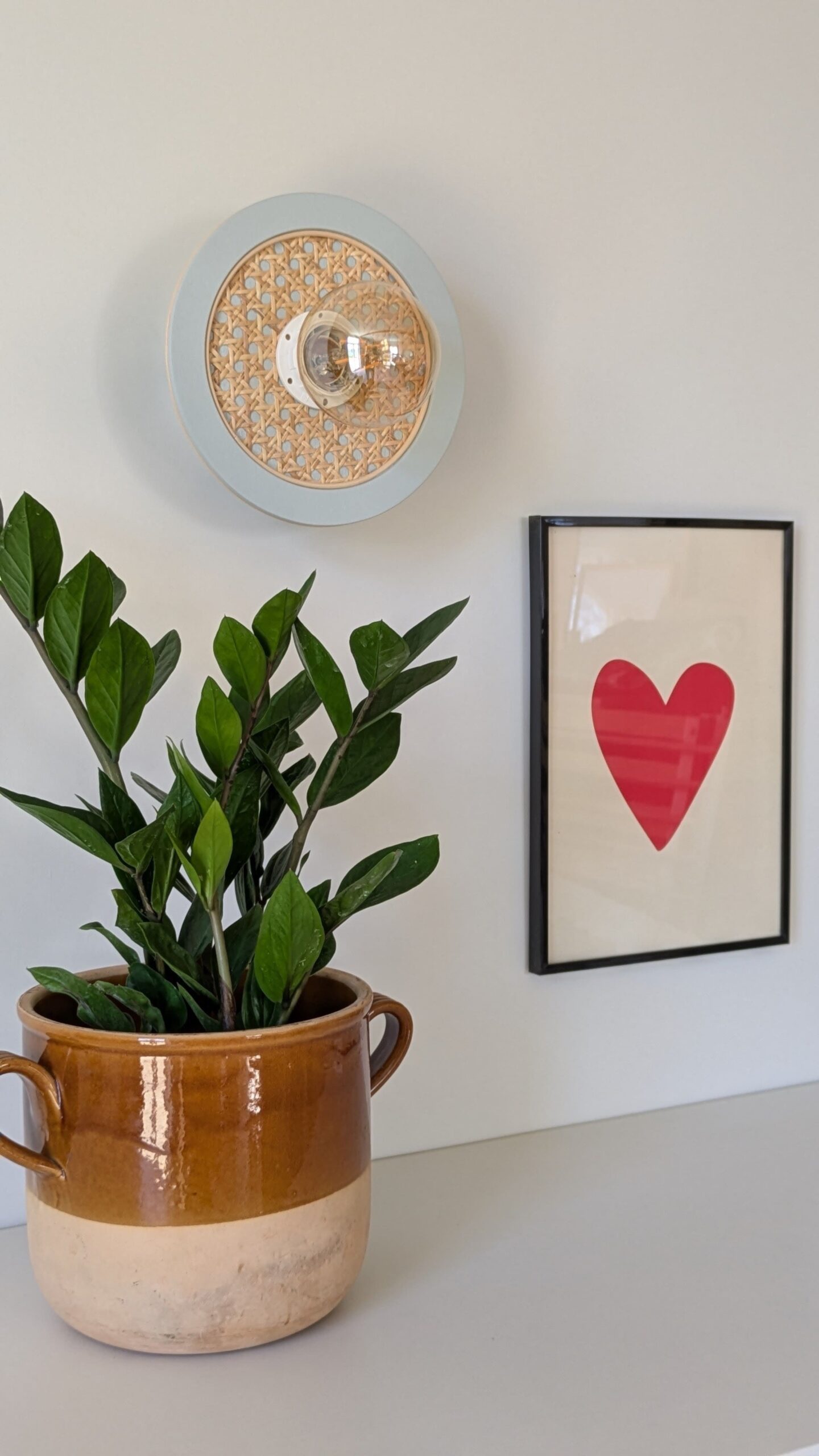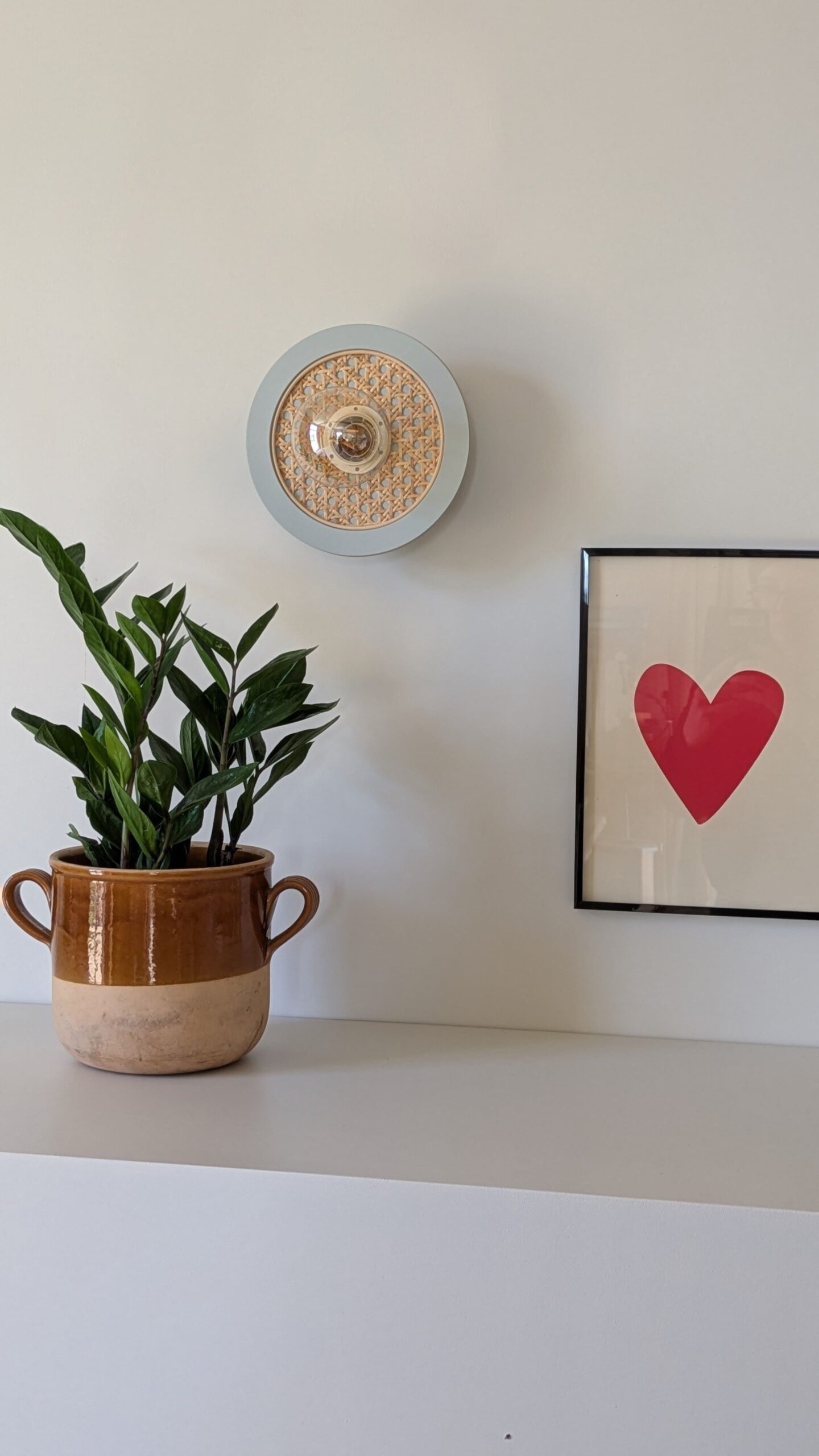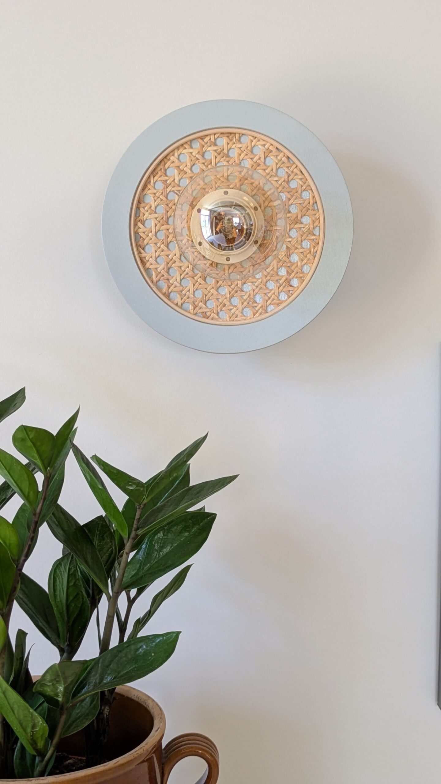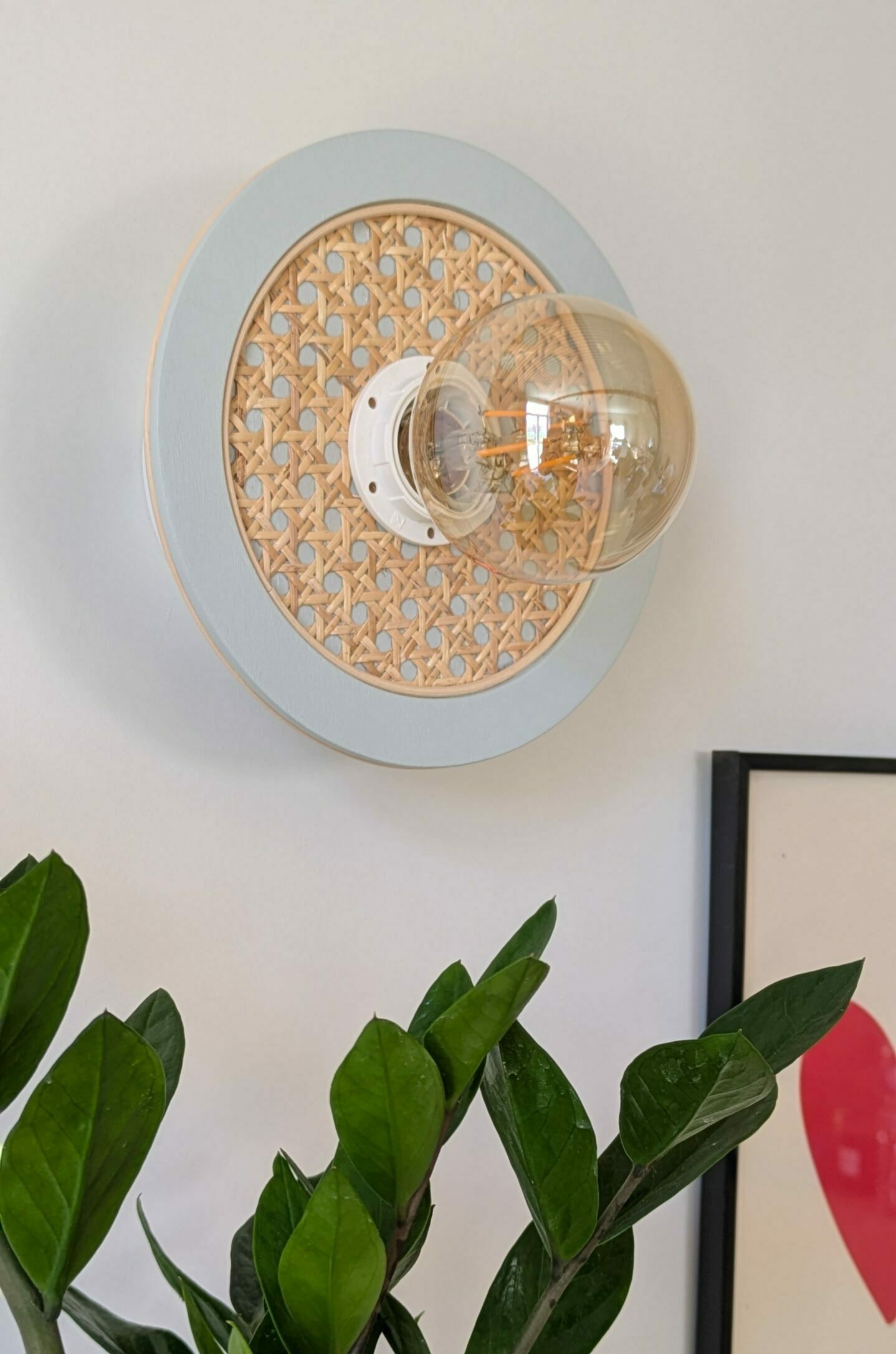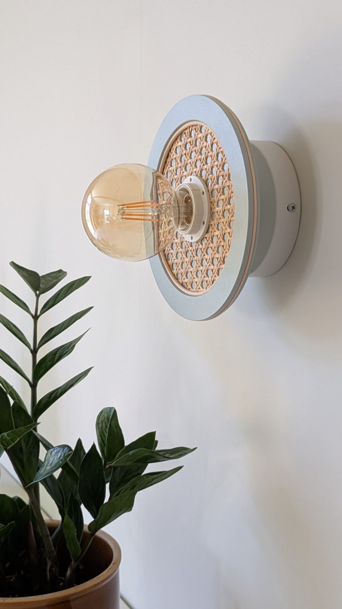 Luminaire artisanal modulable en bois, rotin et cannage. 🌿 Ce modèle peut devenir suspension, applique (murale ou nomade), plafonnier ou lampe.